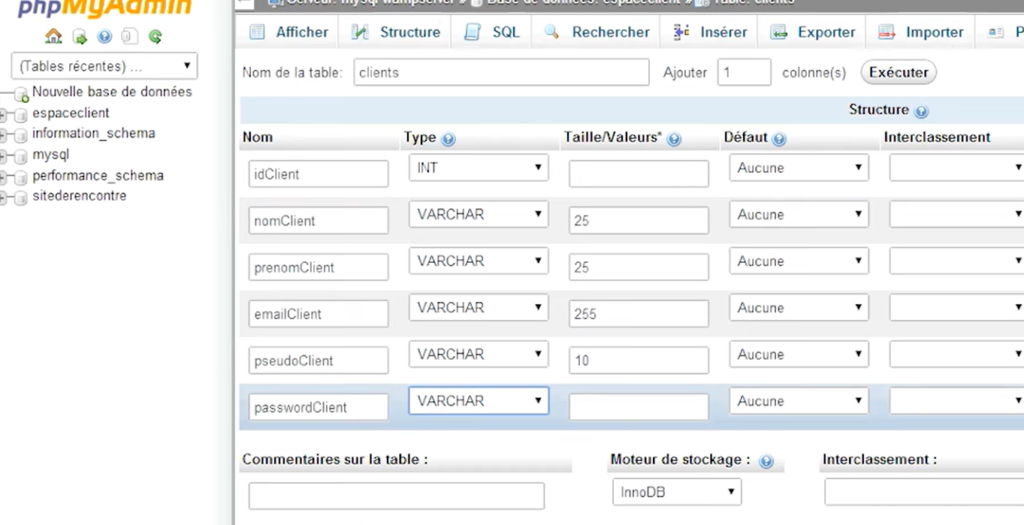 Utilisation des methodes merises pour la création de la base de donnée et realisation avec Mysql (PHPMyadmin):